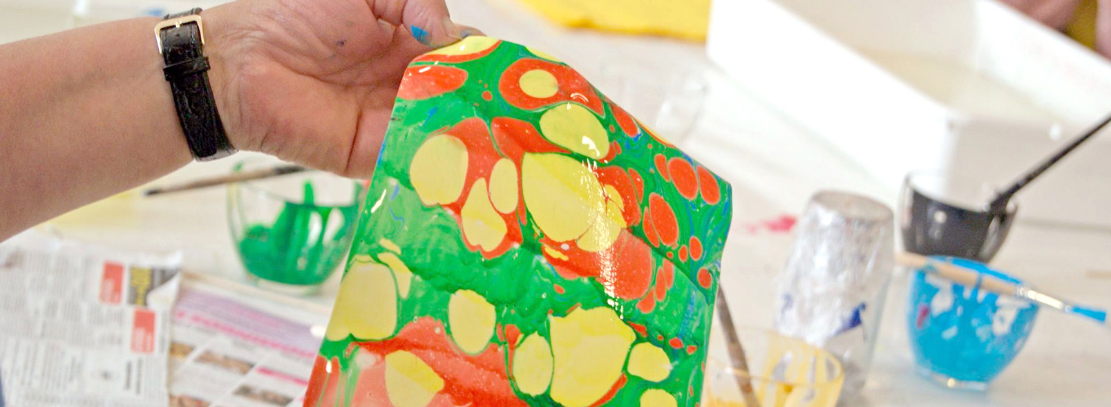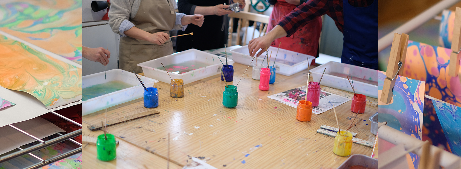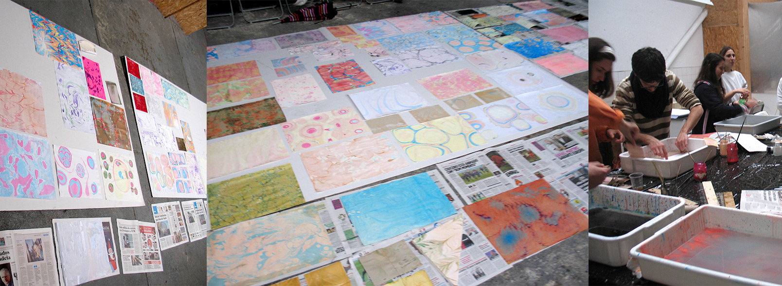 Neste espaço de formações, além das várias formações à volta da encadernação manual, leccionei algumas edições de marmorização de papel. Com duração de 3 horas, o programa desta formação consiste na apresentação de fórmulas de banho e de tintas e de processos de desenho básicos de padrões tradicionais de papel marmorizados.