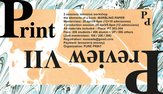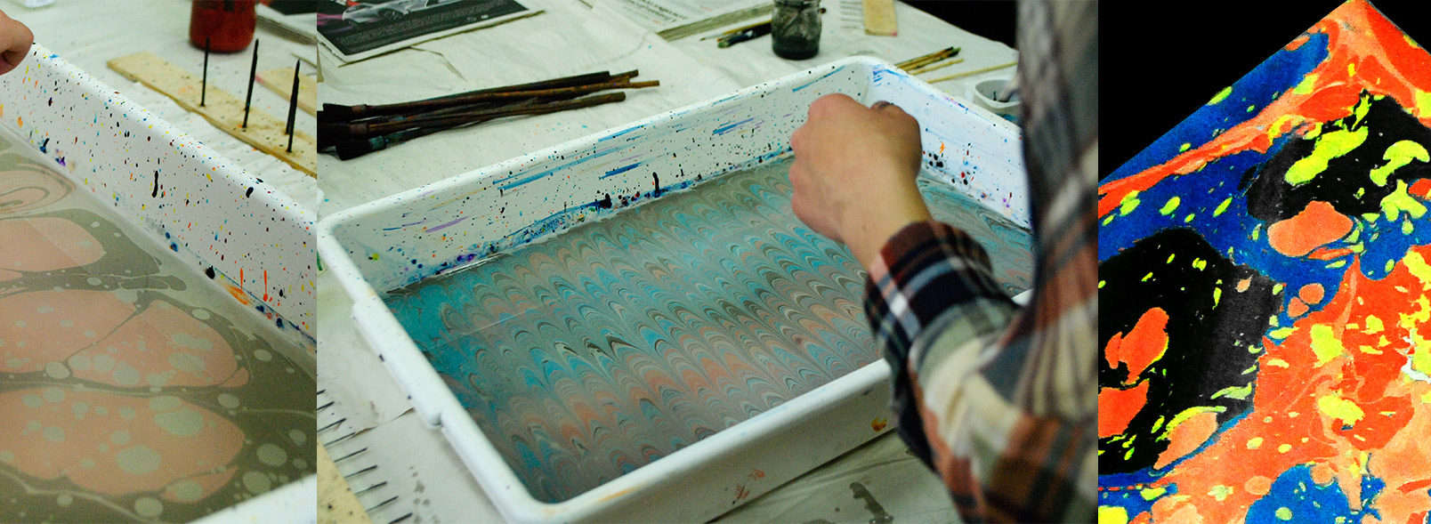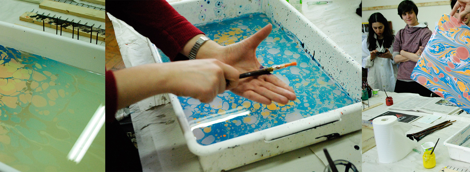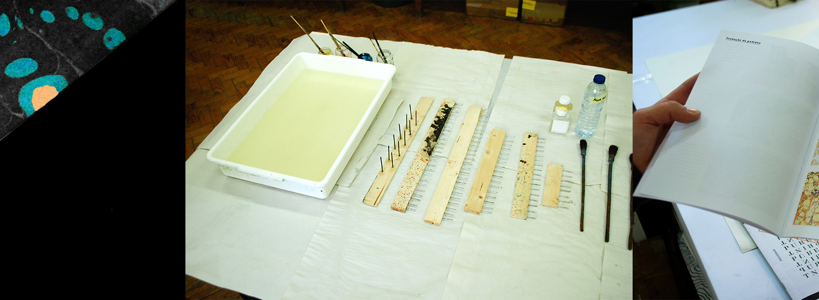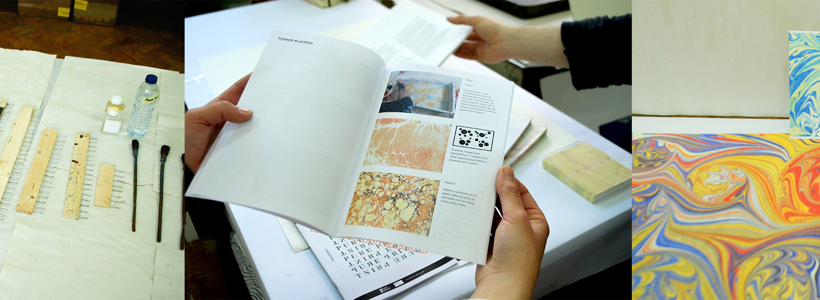 During my MA's thesis about bookbinding, I participated in a 5 months research about paper marbling at FBAUP's workshops. This research is documented in the publication Papel Marmorizado: Reprodução e criação em contexto oficinal na FBAUP (Paper Marbling: reproduction and creation in the context of FBAUP's workshops). It was only possible in the coordination of Prof. Dr. Graciela Machado (FBAUP's Printmaking Main Teacher) and the well coordinated team of Ana Margarida Rocha, Cláudia Queirós, David Lopes and Giulia Ferrigato.